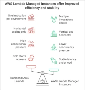 ANS: – AWS Lambda Managed Instances allow multiple invocations to run concurrently within a single execution environment backed by shared Amazon EC2 capacity. This improves compute utilization, reduces the number of execution environments required, and lowers reliance on account-level concurrency limits and provisioned concurrency. As a result, applications see lower cold starts, more stable latency, and reduced costs at scale.